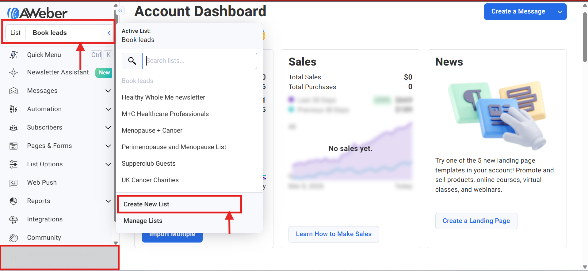Log into your AWeber dashboard. In the top navigation, click Lists, then select "Create New List".