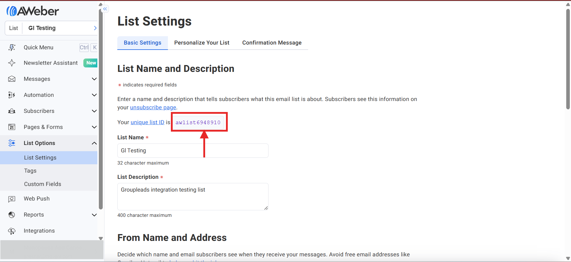 Inside List Settings, you'll find your Unique List ID — it looks something like awlist6948910. The ID is the number that appears after awlist.