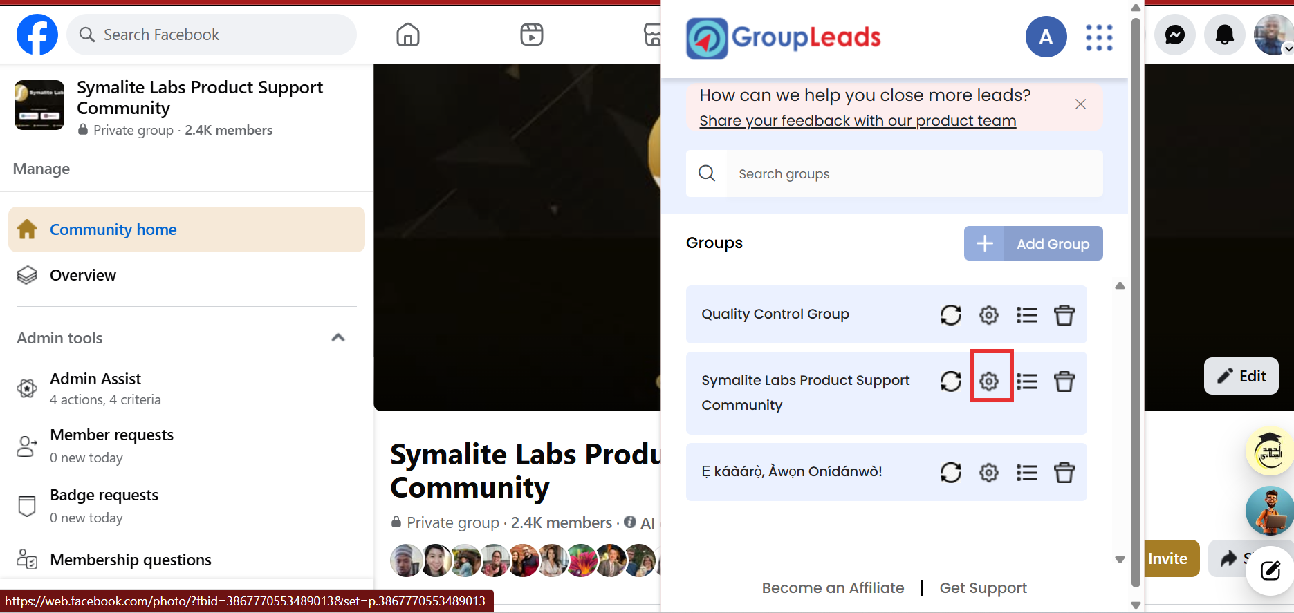 Inside the extension, locate the Facebook Group you want to collect emails from, then click the ⚙️ settings wheel icon next to that group.