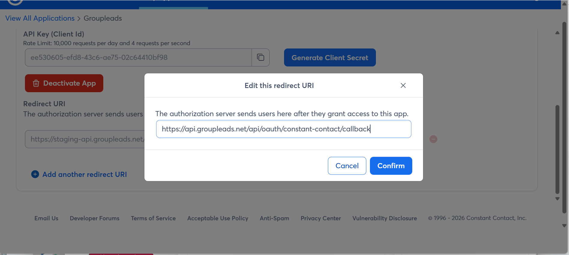 - Paste the following URL: https://api.groupleads.net/api/oauth/constant-contact/callback