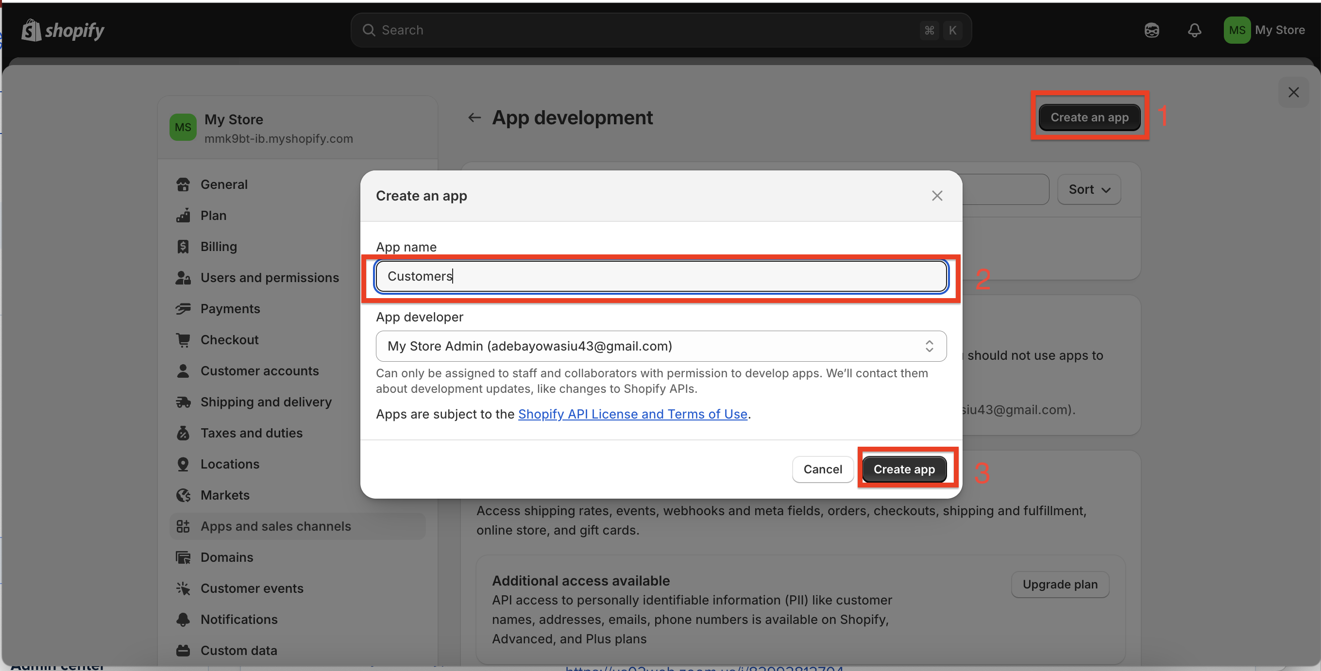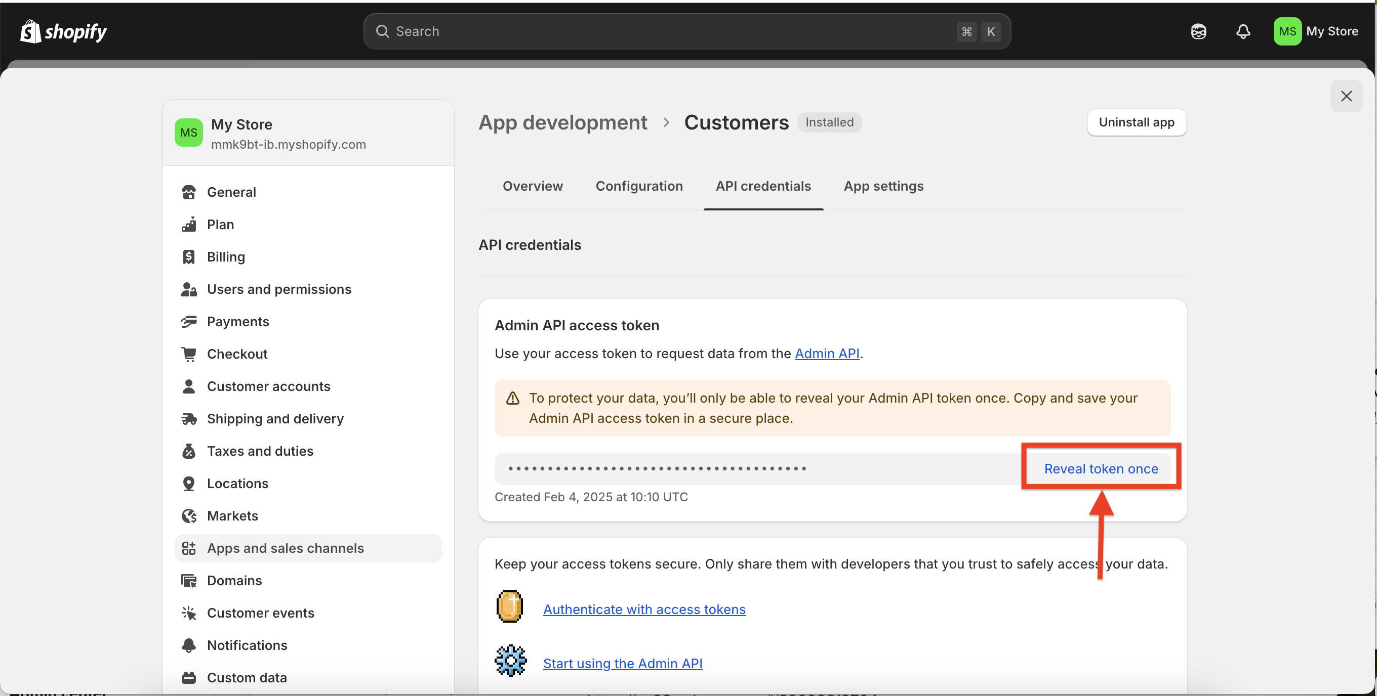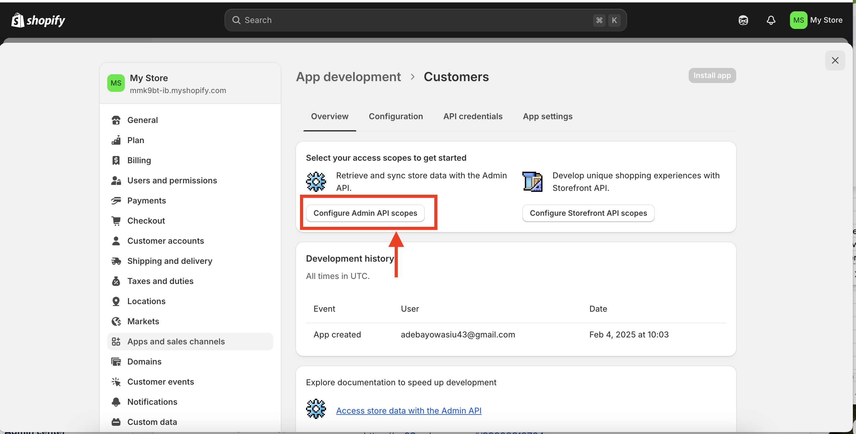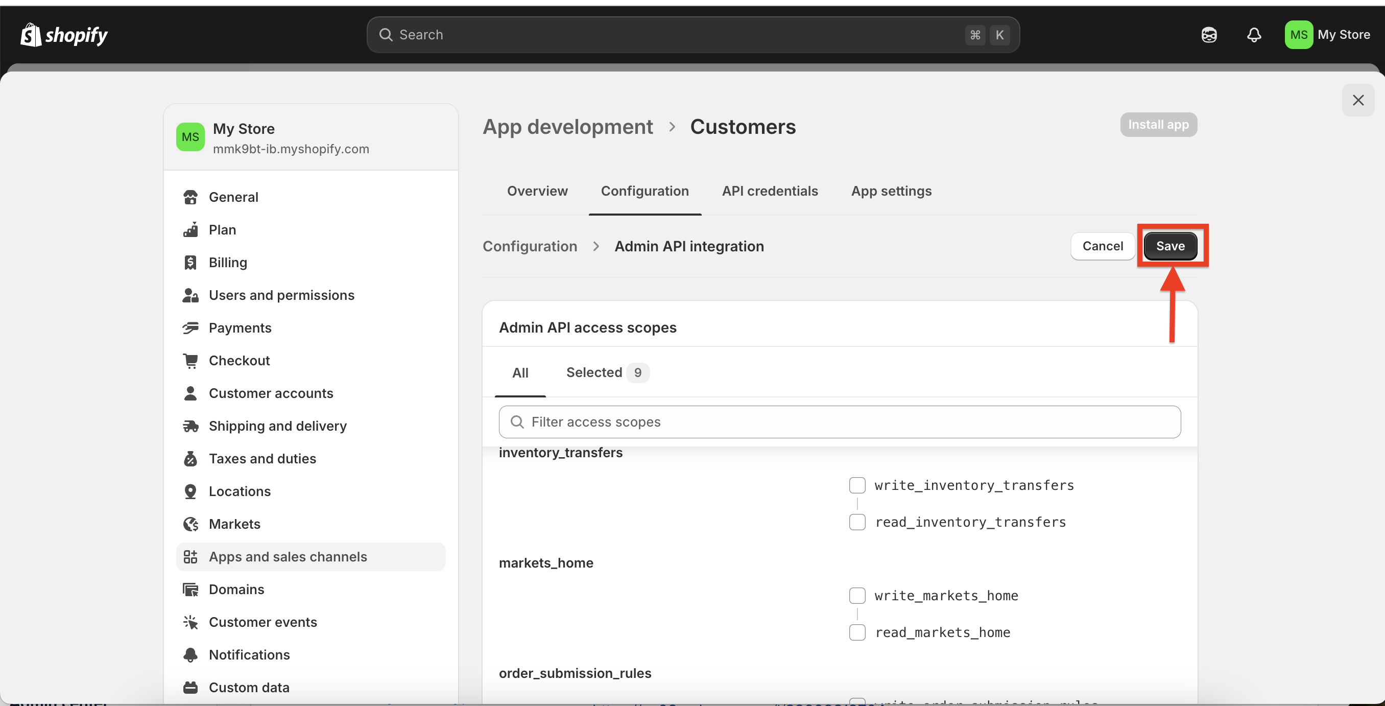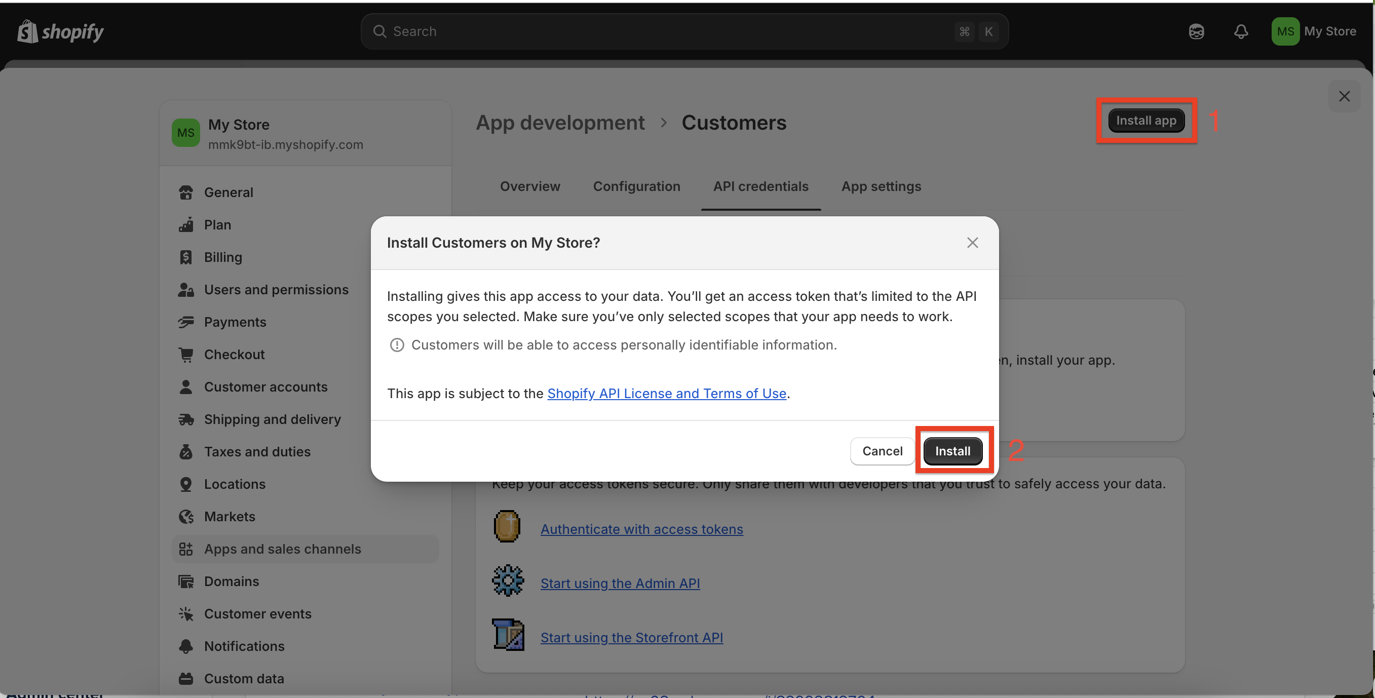 - Check the required API permissions listed in the bracket (read_analytics, read_apps, write_customers, read_customers, read_customer_events, write_discovery, read_discovery, write_customer_merge, read_customer_merge).