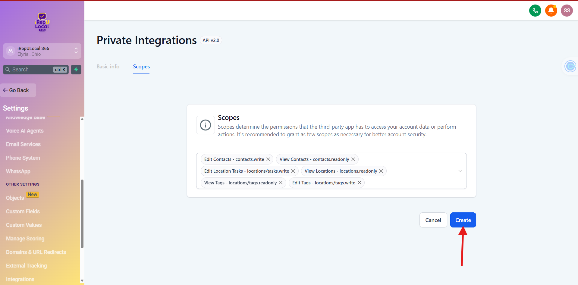 These scopes allow Group Leads to create and update contacts, apply tags, and access basic location data required for the autoresponder to work correctly.